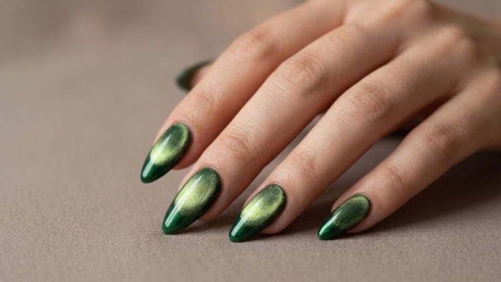 A deep green color is perfect for all of the upcoming holidays because it’s ride-or-die throughout the winter. You won’t be able to take your eyes off your hands once you add the shimmering velvet-glass effect.